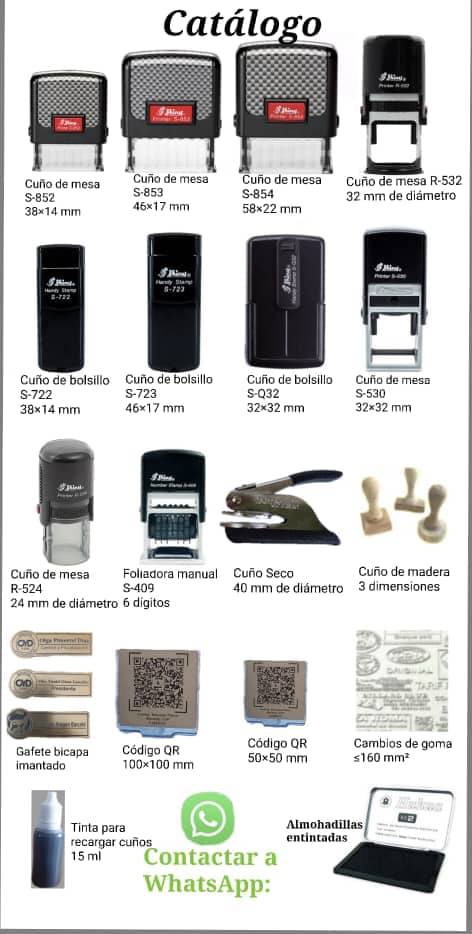 - ☑️Cuño de mesa S-852 de 38×14mm (Rectangular) - ✅Cuño de mesa S-853 de 46×17 mm (Rectangular) - ✅Cuño de mesa S-854 de 58×22 mm (Rectangular) - ☑️Cuño de mesa R-532 de 32 mm de diámetro (Circular) - ✅Cuño de mesa S-530 de 32×32 mm (Cuadrado) - ☑️Cuño de bolsillo S-722 de 38×14 mm (Rectangular) - ✅Cuño de bolsillo S-723 de 46×17 mm (Rectangular) - ☑️Cuño de bolsillo Q-32 de 32×32 mm (Cuadrado) - ✅Cuño de mesa en madera con 3 dimensiones: Rectangular 50x20 mm Cuadrado 40x40 mm Circular 40 mm de diámetro - ☑️Foliadora MANUAL de 6 dígitos - ☑️Foliadora AUTOMÁTICA de 10 dígitos Otros servicios: - 🛎️Se realizan CAMBIOS DE GOMAS - 🛎️Confección de GAFETES bicapa imantados - 💰Venta de ALMOHADILLAS ENTINTADAS para cuños - 🛎️Confección de DIJES para mascota - 🛎️Confección de CÓDIGOS QR Radicamos en el vedado